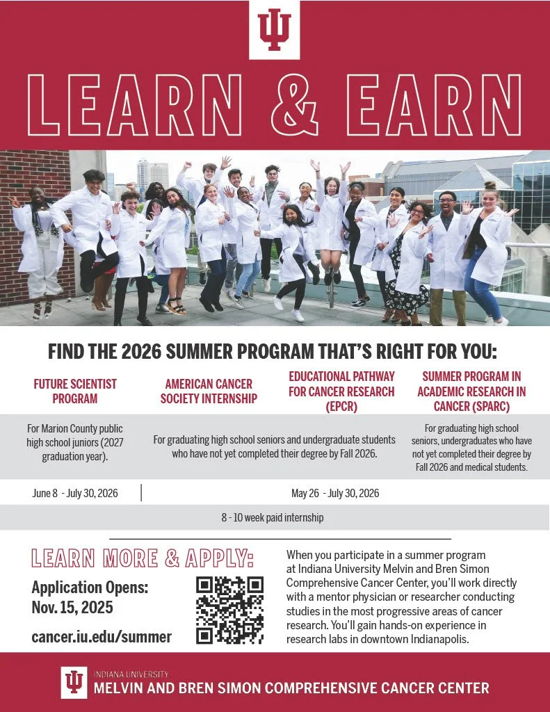 High school juniors (rising seniors) with a keen interest in science and the ability to work independently and responsibly are encouraged to apply for the program, a non-credit enrichment/summer research experience sponsored by the Indiana University Melvin and Bren Simon Comprehensive Cancer Center. Recognizing that the scientific/research community in the United States today is challenged because fewer high school graduates are choosing science as a career.